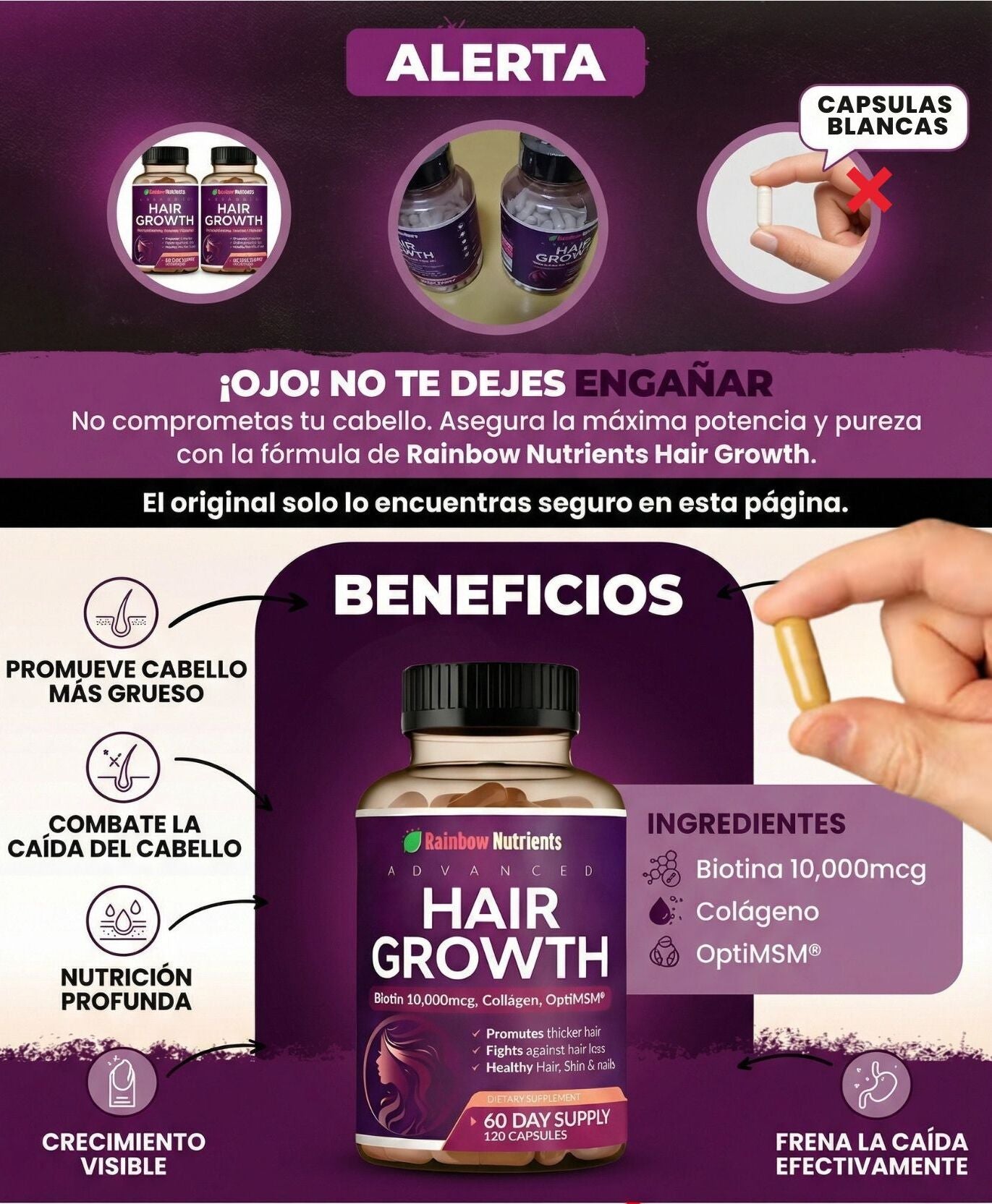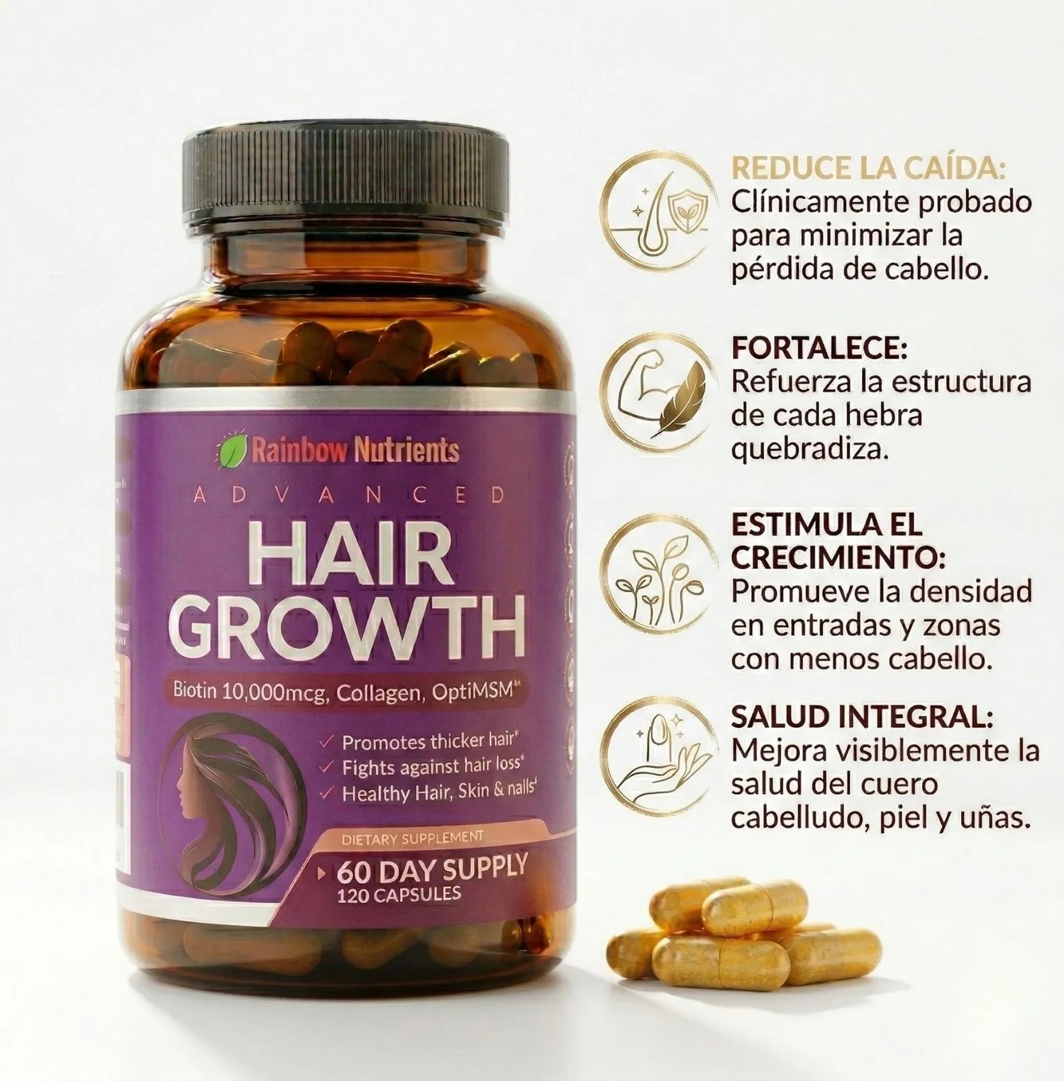 Hair Growth está formulado con vitaminas, minerales y extractos naturales. Es bien tolerado. No se recomienda en embarazo o lactancia sin aprobación médica.